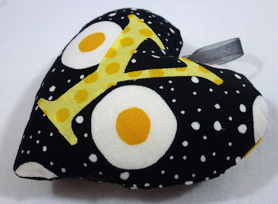 This one is a bit of a stretch; I don't know what the print on this fabric is suposed to be, but to me it looks like slices of hardboiled eggs. With the "Y" added to it, this heart looks strangely like a face! One of my readers, Kay, left a comment in a previous post suggesting I use a sunshiny-yellow fabric for the "Y"--I love that idea, but I had already cut out this fabric by the time I read her comment!